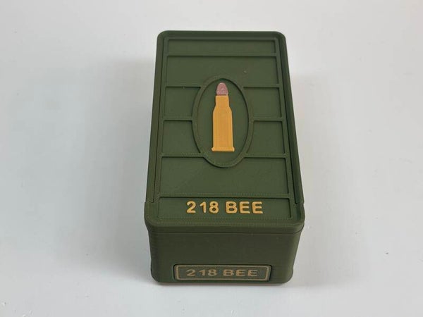 Met dit ontwerp kunt u 50 patronen van kaliber .218 Bee opbergen, waarbij de kogel met de punt naar beneden aan de rand hangt.